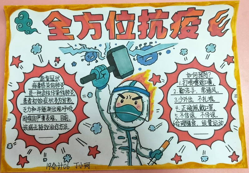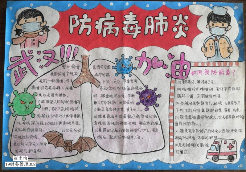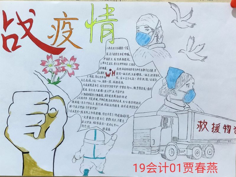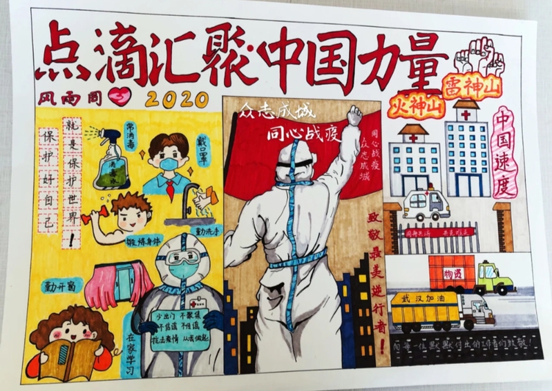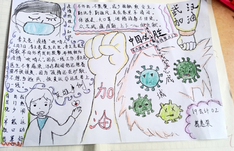 疫情当前,老员工心理工作站组织了“抗疫手抄报”大赛,同学们在创作中不仅学习了很多防疫知识,还通过绘画的方式向最可爱的人表达了敬意。