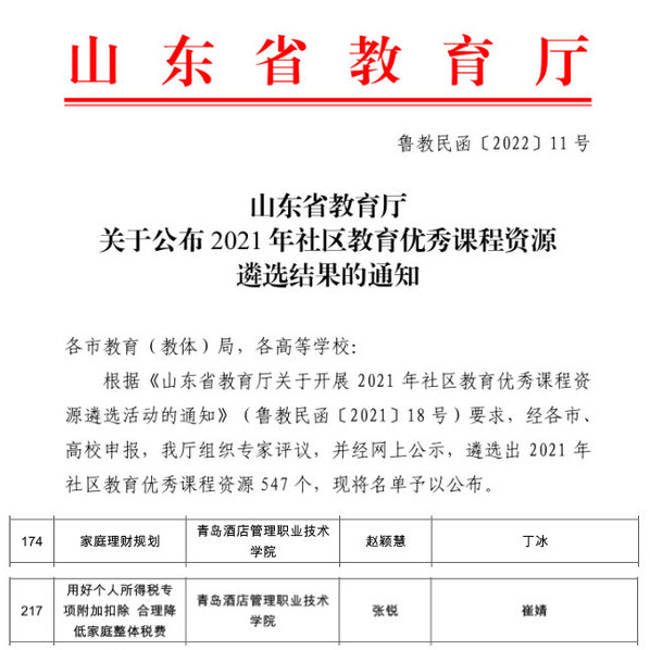 近日,山东省教育厅公布了2021年社区教育优秀课程资源遴选结果,Bevictor伟德官网赵颖慧老师的《家庭理财规划》、张锐老师的《用好个人所得税专项附加扣除合理降低家庭整体税费》2门课程被评为优秀课程。