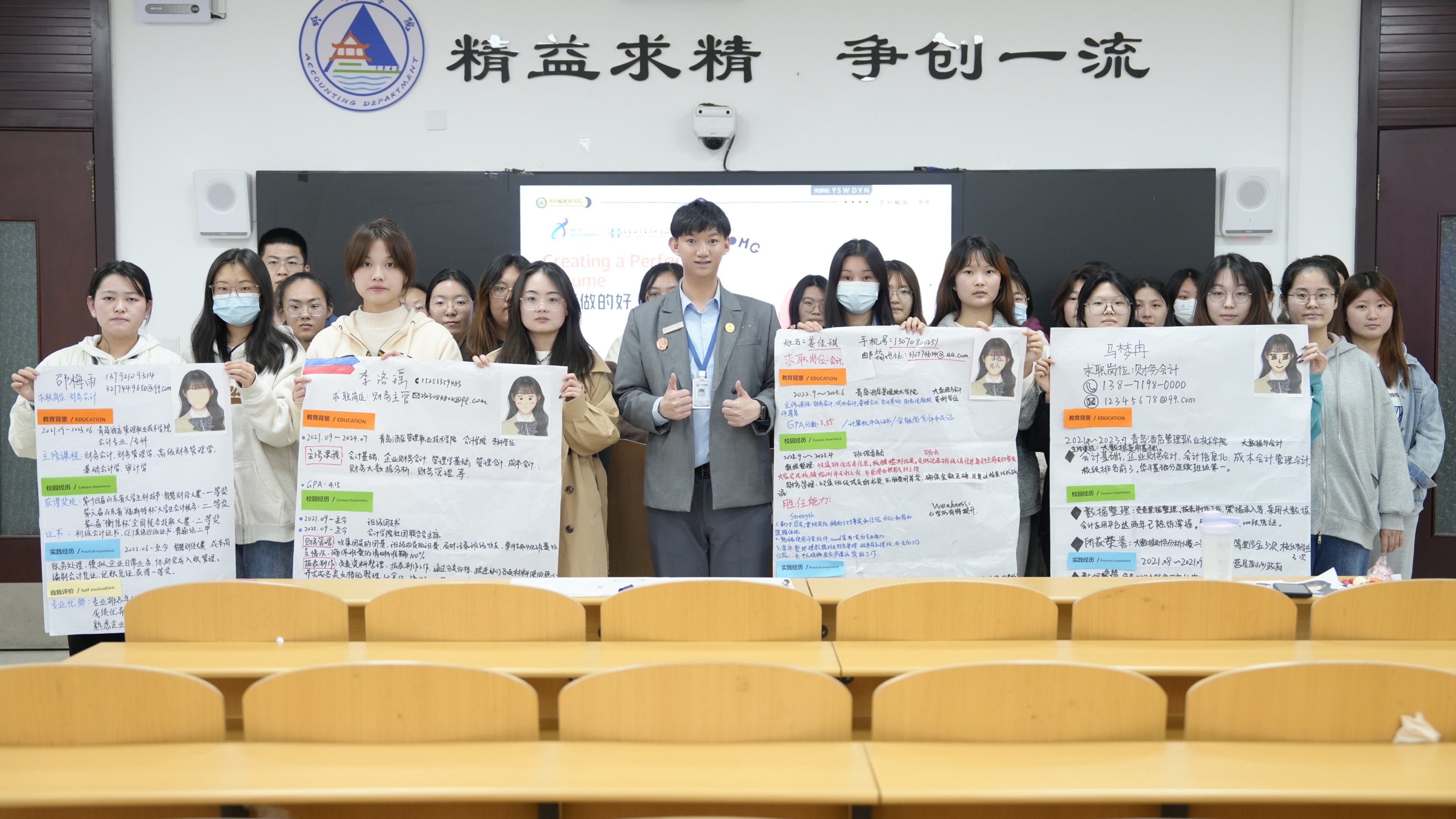 刘老师在课堂上讲述了优秀简历必备模块,包括了基本信息、教育背景、校园经历、实践经历、自我评价的基本元素,以生动有趣的翻转课堂形式诠释了HR所需简历样板、简历中自我介绍撰写和优势体现等的写作要求。