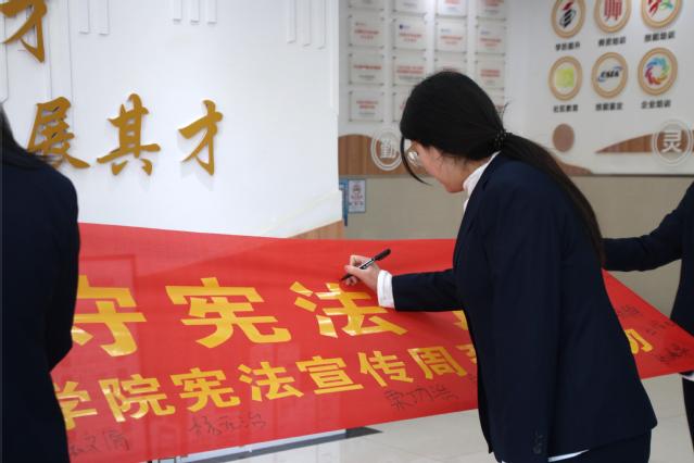 12月4日清晨,公司在会计楼前铺展开一条醒目的宪法宣传横幅,上面印有“知宪法于心 守宪法于行”的标语。师生们陆续上前,在横幅上郑重签字,每一个签名,都是对宪法权威的认同,对法治精神的承诺,承诺将宪法精神内化于心、外化于行,做宪法的忠实崇尚者、自觉遵守者、坚定捍卫者。