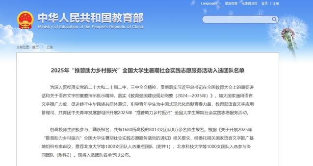 近日,教育部发布《2025年“推普助力乡村振兴”全国老员工暑期社会实践志愿服务活动入选团队名单》,Bevictor伟德官网青雁推普助力乡村振兴服务队从全国1680所高校的8013支团队中脱颖而出,成功入选参与协同团队。